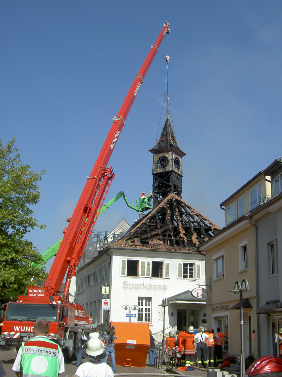 Ein Ereignis, welches den Menschen in Tettnang im Gedächtnis geblieben ist, war der Brand der alten Sparkasse 2006. Das historische Gebäude in der Montfortstraße brannte nieder und konnte trotz großer Bemühungen der Feuerwehr nicht mehr gerettet werden. Denn das Türmchen war nach dem Brand einfach zu baufällig. Und dann wurde auch noch die goldene Uhr entwendet, die dem historischen Gebäude seinen Charakter gegeben hatte. Die teba kaufte das Areal schließlich, um dort neu zu bauen. Es gab in der Stadt große Diskussionen darüber, wie und was gebaut werden sollte. Heribert Geiger setzte sich zusammen mit Altbürgermeister Grasselli sehr dafür ein, dass hier wieder eine besetzte Filiale der Sparkasse einzog.